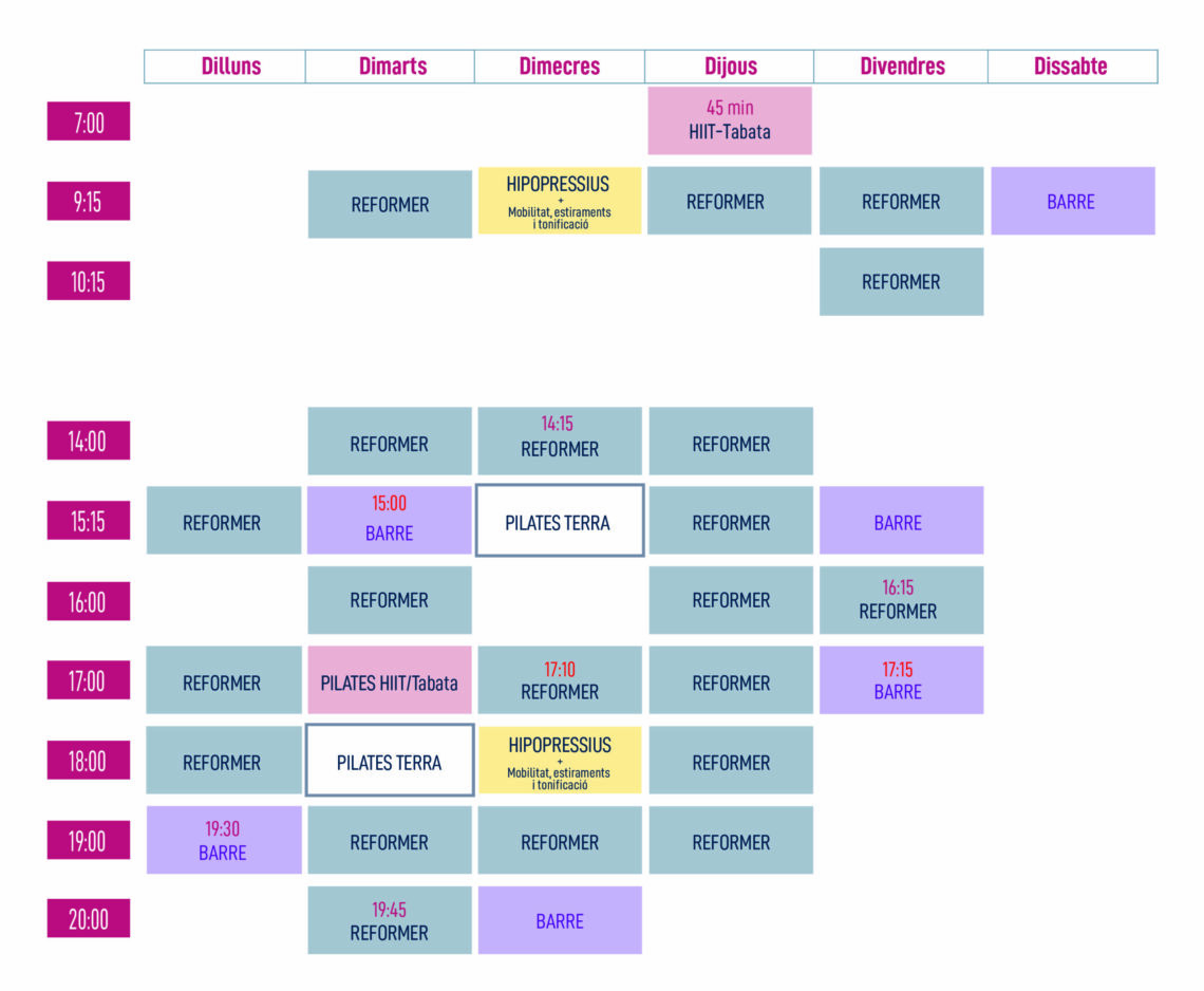 Les sessions tenen una durada de 50 min. en totes les activitats menys en les classes de Pilates Reformer i Barre, que tenen una durada 45 min. Segons la seva disponibilitat i la del centre s'adjudicarà una hora fixa, podent modificar (sempre que hi hagi lloc en alguna altra activitat) o cancel·lar les seves sessions amb 8 hores d'antelació.